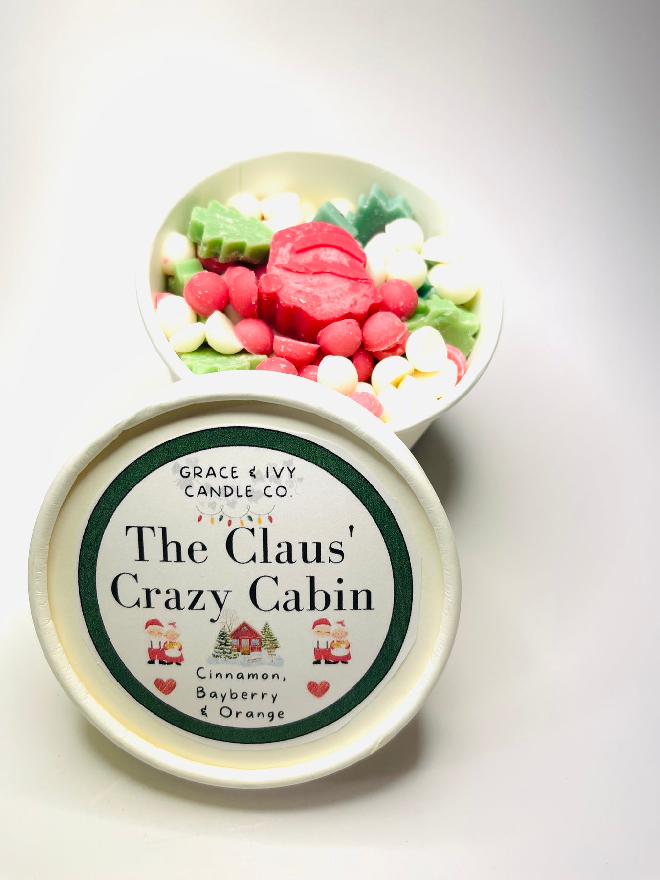Claus' Crazy Cabin: Red and white dots, green trees, a Santa Head wax tart.