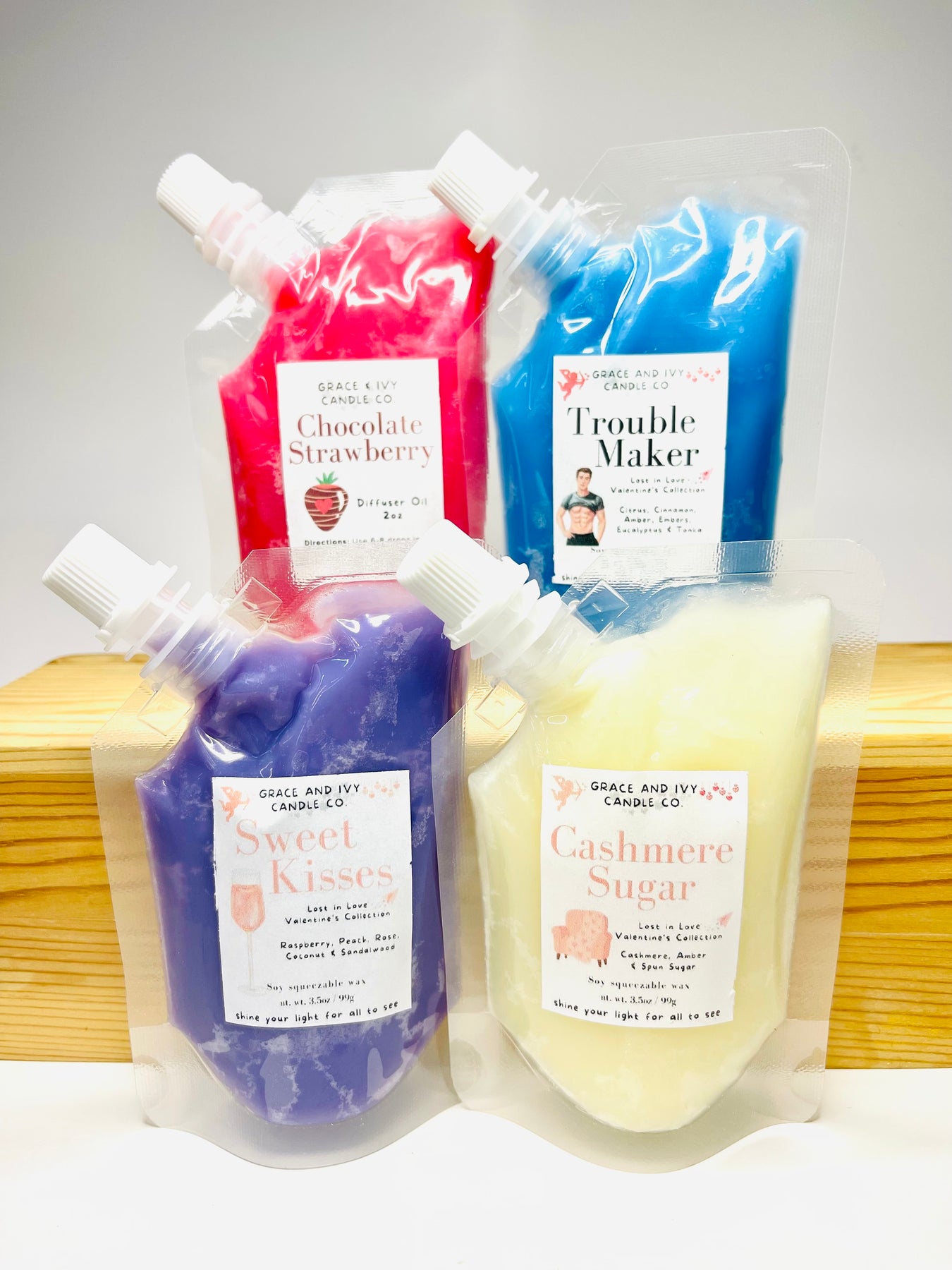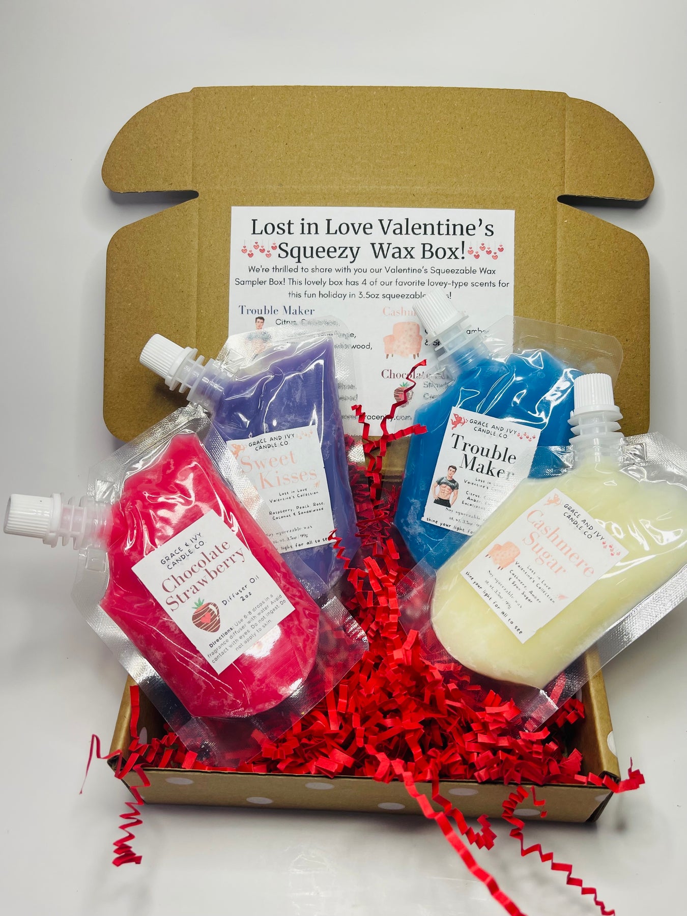 Love is in the air! Nope. That's just great smells from Grace and Ivy. Our Lost in Love Valentine's Squeezy Sampler Box includes 4 of our 3.5oz squeezy bags, each promising to tantalize your senses and having you swooning.
