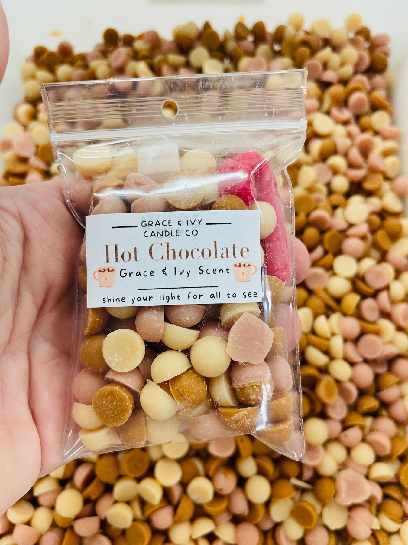 HOT CHOCOLATE – Cream, caramel, milk chocolate, and soft cocoa-colored wax dots in our Hot Chocolate scent. Rich and cozy notes of creamy chocolate, warm milk, and sweet cocoa for the ultimate winter comfort.